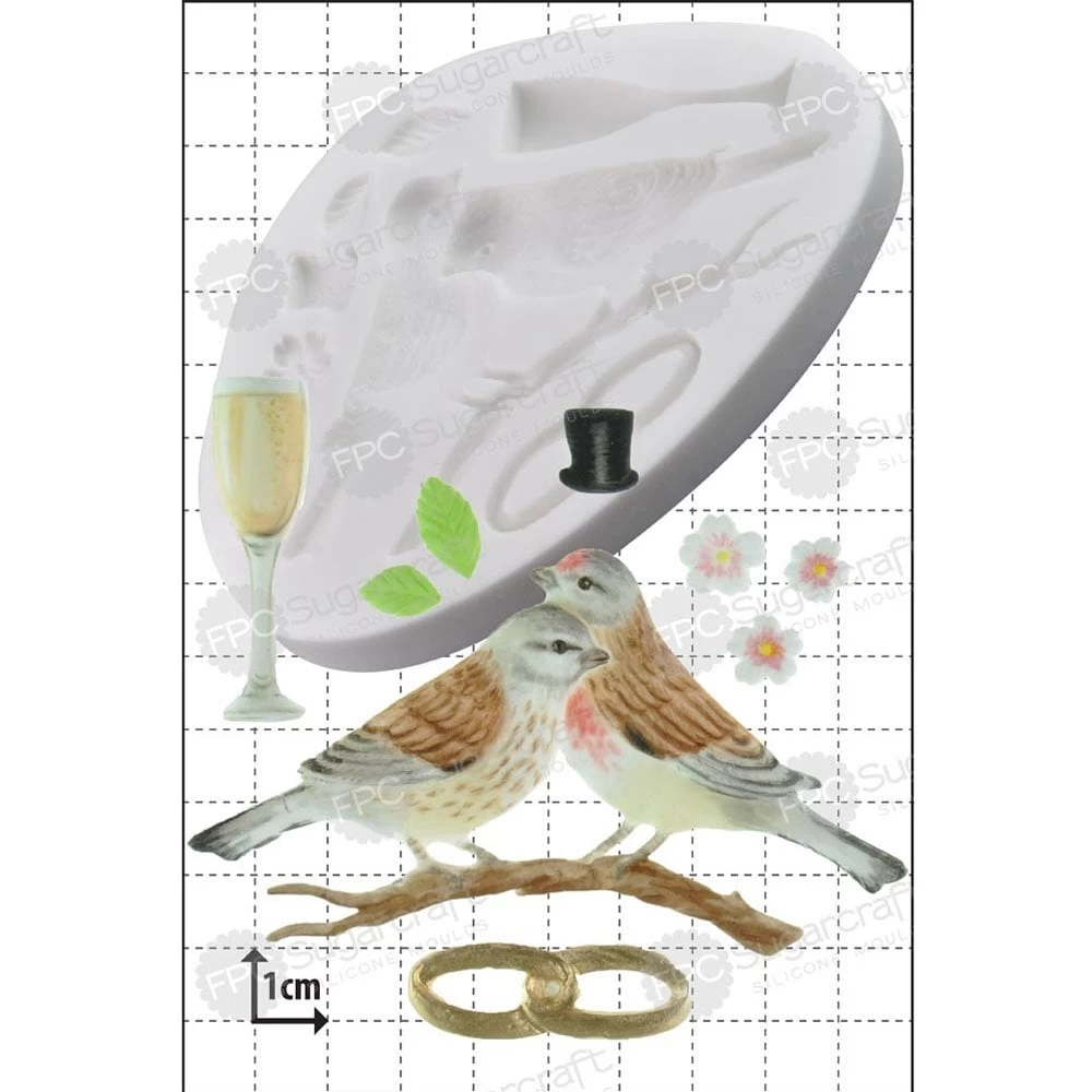 Hand sculpted pair of lovebirds, with flower buds, champagne flute, and interlocking wedding rings.