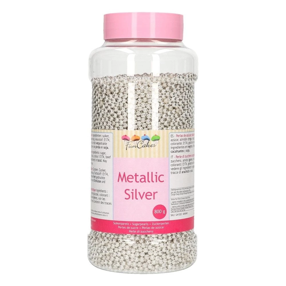 The FunCakes sugar pearls metallic silver are ideal for making decoration accents, such as in the heart of a flower, as a border along with a cake or on a cupcake.