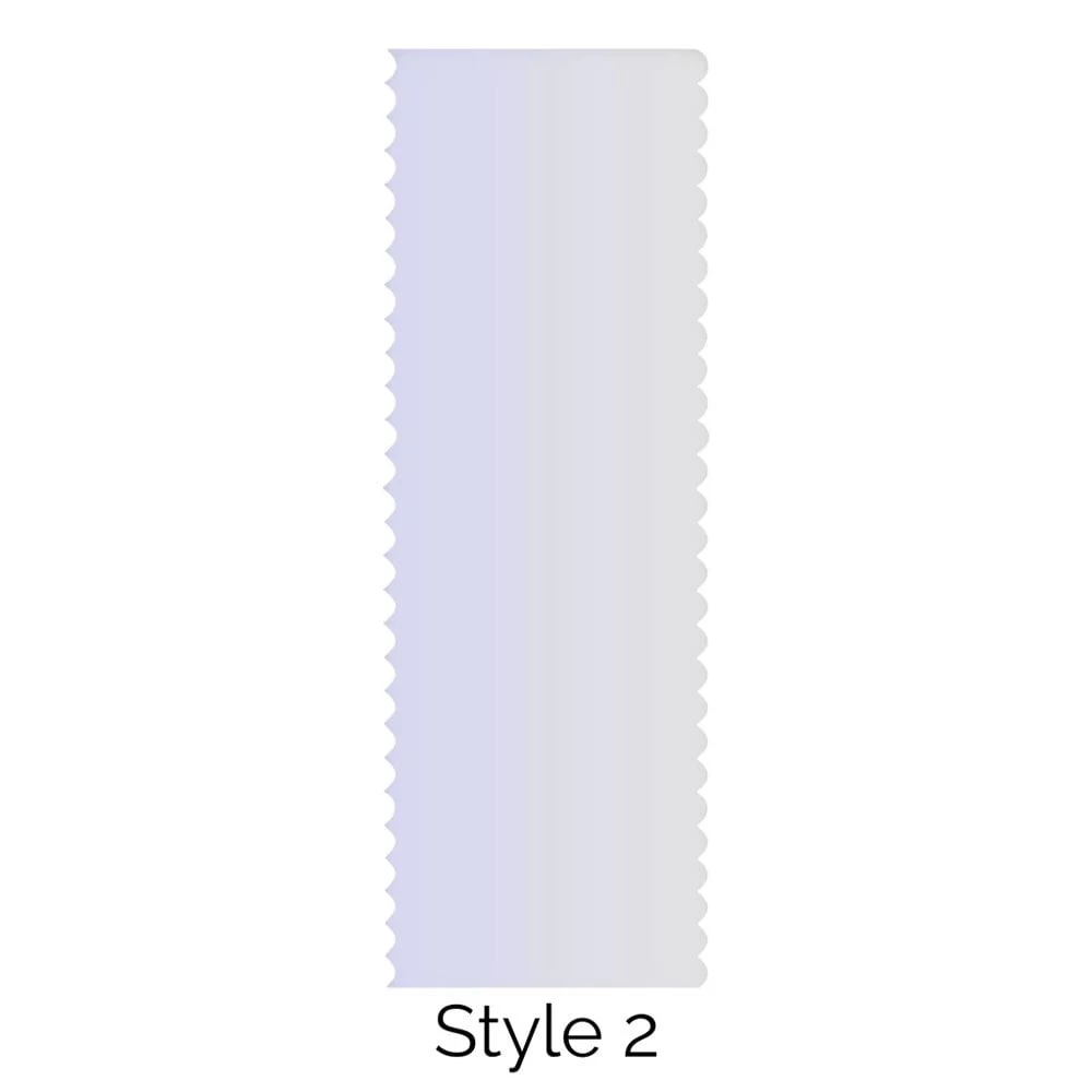 This Cake Scraper is a quick way to give your cake that professional finish. It allows you to easily and efficiently create a great clean finish with just a few swipes. Simply cover your cake with a generous amount of buttercream, ganache, icing, chocolate or frosting, hold the scraper vertical and run the scalloped edge around your cake. This scraper is double-edged so can be used to produce two different style finishes!